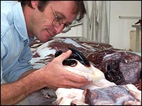 "Now we can say that it attains a size larger than the giant squid. Giant squid is no longer the largest squid that's out there. We've got something that's even larger, and not just larger but an order of magnitude meaner." This squid has one of the largest beaks known of any squid and also has unique swivelling hooks on the clubs at the ends of its tentacles. Bigger still This combination allows it to attack fish as large as the Patagonian toothfish and probably to also attempt to maul sperm whales.